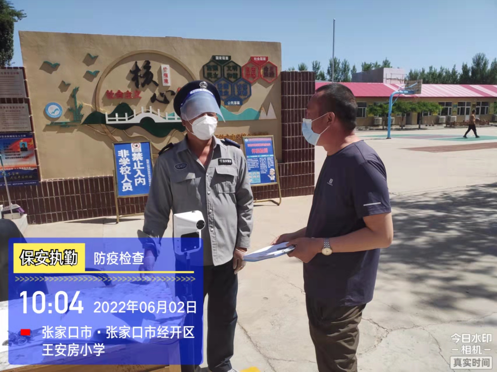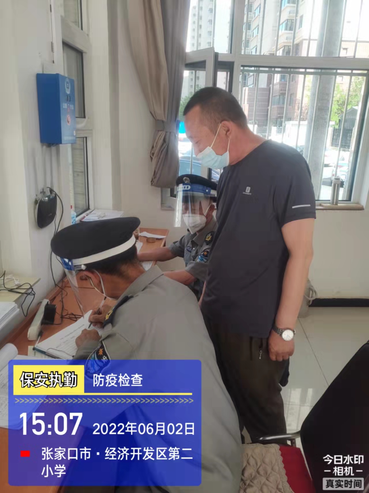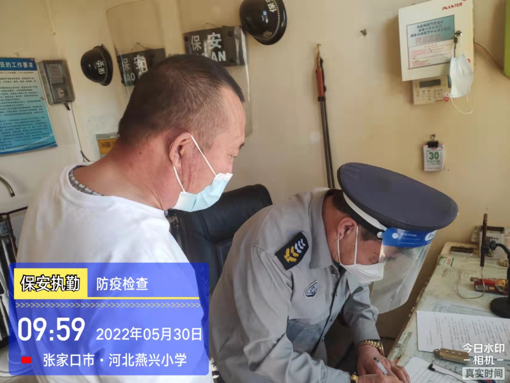 會后,我公司迅速召開“疫情期間學校門衛(wèi)安全防控工作要求”的會議,制定了校園安全防疫規(guī)定:疫情防控期間,校園保安隊員必須穿制服,規(guī)范佩戴“三件套”(防護隔離面罩、N95口罩、一次性PVC手套);進出校園的師生必須測量體溫,外來人員需登記、測溫、掃碼(幸福張家口,呈綠碼)、且持7日內(nèi)核酸陰性檢測結果;保安室需保持干凈整潔,物品擺放有序,勤開窗通風,定期噴灑消毒藥水。為此,公司特成立校園防疫檢查小組,由副經(jīng)理帶隊,協(xié)同主管大隊長對經(jīng)開區(qū)所有中小學校安保崗位進行防疫工作檢查,檢查期間,發(fā)現(xiàn)問題,現(xiàn)場處理,并及時與校方領導溝通,杜絕同樣問題再次出現(xiàn),確保校園防疫安保工作萬無一失,為各校師生鑄就一道安全防線!